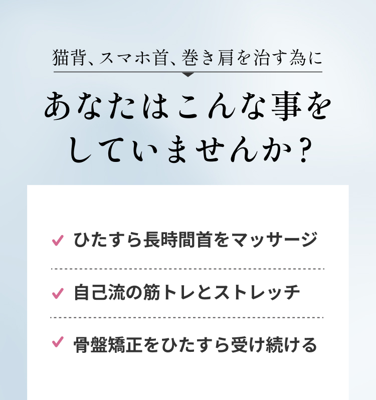 「もうだめだと諦めていた猫背」 「整形外科でも無理と言われあきらめていたストレートネック」