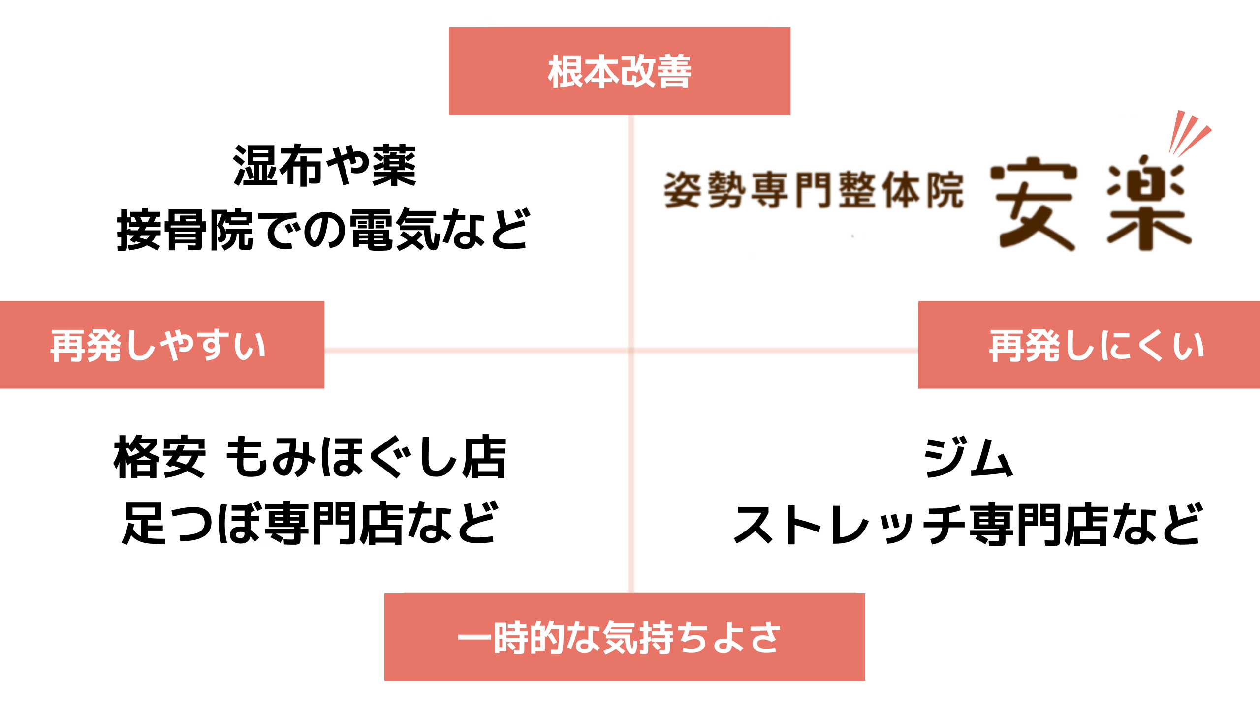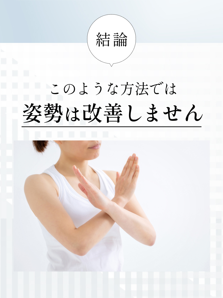 当院では、姿勢の根本改善を最短最速で実現できるよう、下記の3点を念頭にご案内させていただいております。