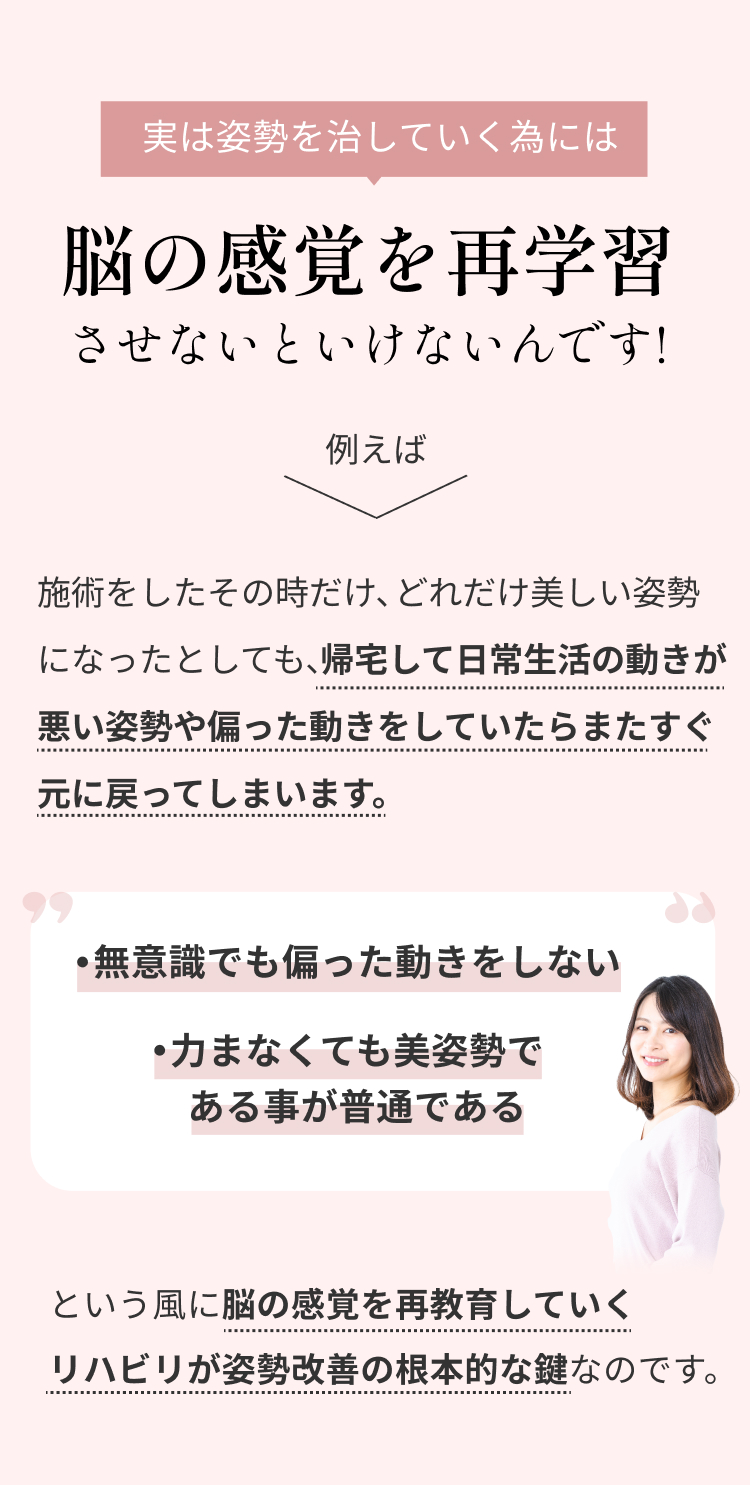 姿勢矯正訓練をへて、無意識に負担がかかってしまうような日常生活動作の癖そのも のを見直していくのです