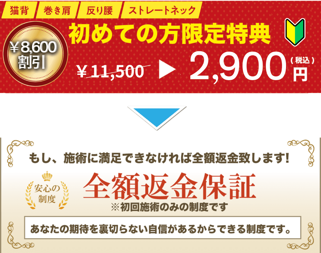 初回体験料は¥3,900です。2回目以降はお選びいただくプランによっても変わりますが、根本的な改善を目的とされます場合はコースにご入会いただく事をおすすめします。
