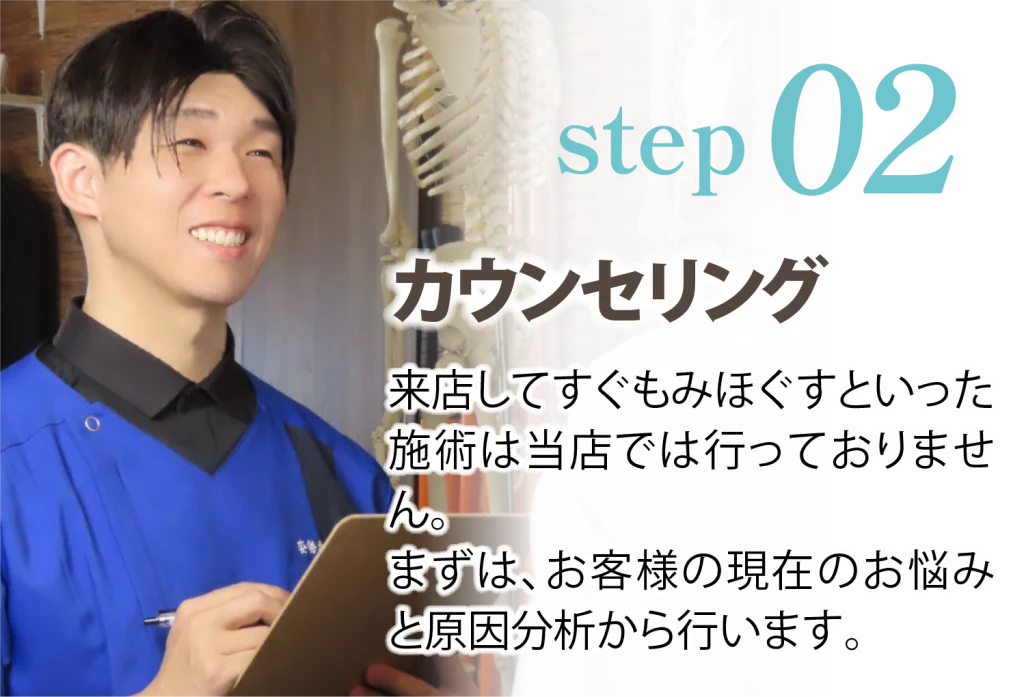初回体験ではまず、現在の課題点を明確にします。初回の変化の度合いによって、頻度や回数の目安をお伝えさせていただいております。