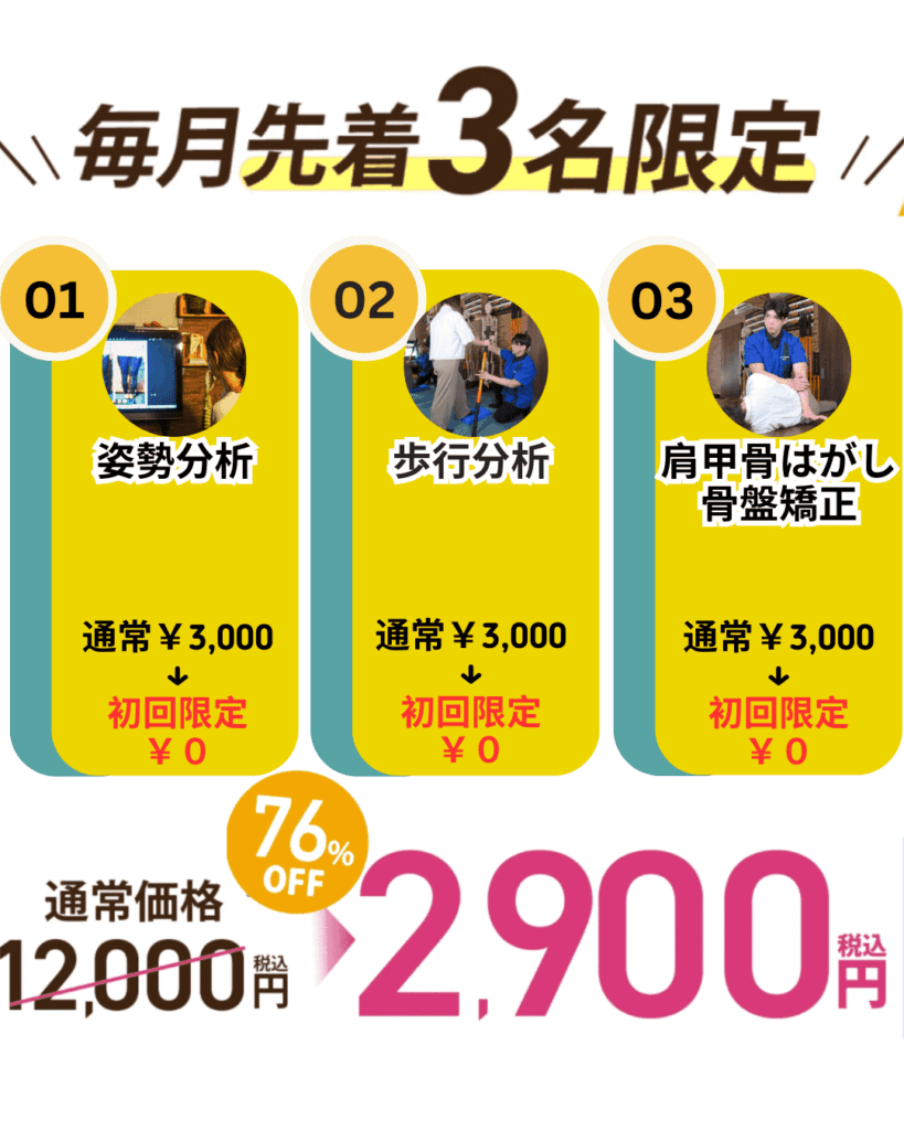 姿勢や肩こりが改善されるのか、私に合っているのか不安もあると思います。そこでまず1度お試しいただきやすいよう初回は特別価格で受診いただけます。効果を実感いただけたら、継続的な受診をご検討ください。