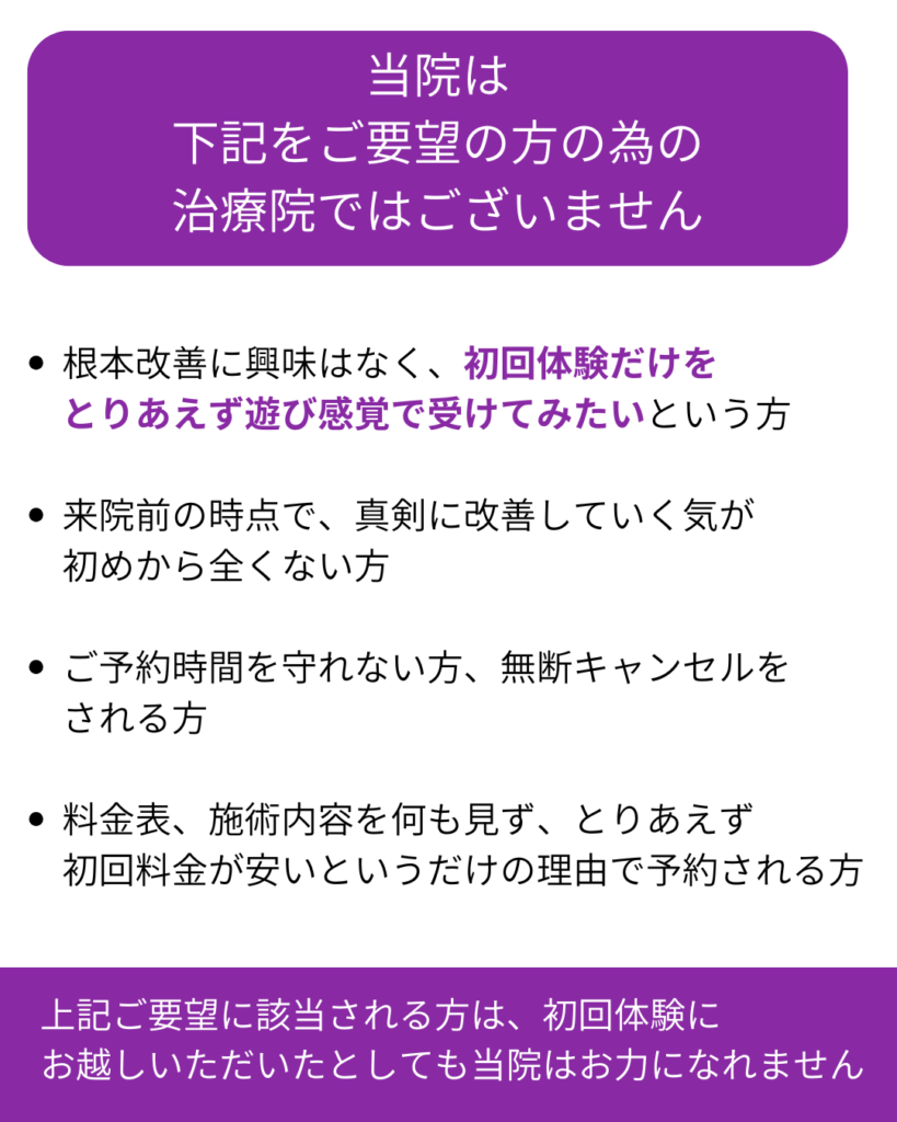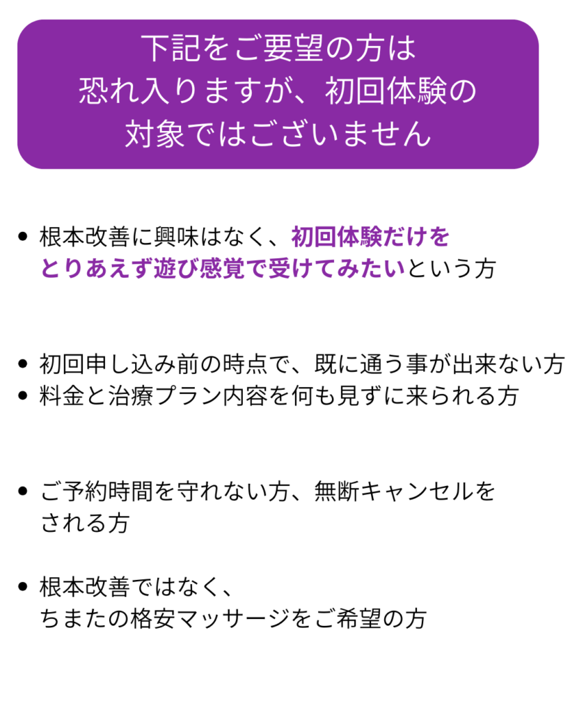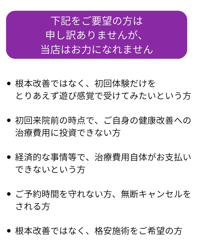 当院の初回体験に是非ともお越しいただきたい方と、お越しいただいても当院ではお力になれない方がおられます。お申し込み前に下記をご確認お願いします。