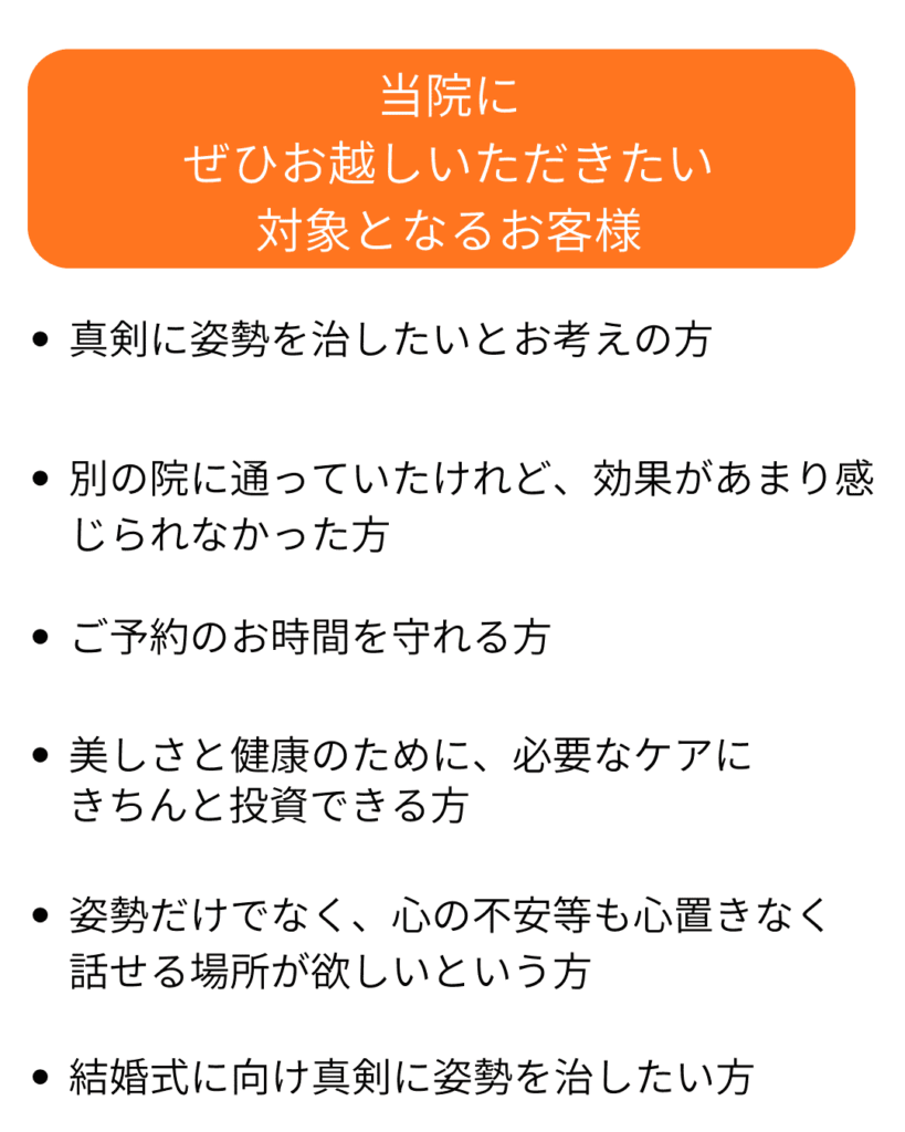 詳しくはブライダル姿勢矯正のページをご覧ください。 結婚式に向けた姿勢矯正 – ブライダル姿勢矯正
