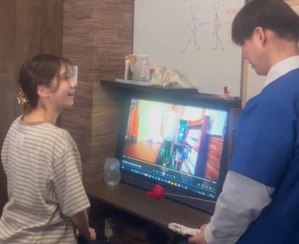 初回体験ではまず、現在の姿勢のお写真と歩く動画を撮影し、大型モニターに映し出し分析をします。