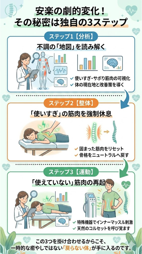 安楽では、根性論ではなく、科学的なアプローチで「無意識でも整う体」を作り上げます。