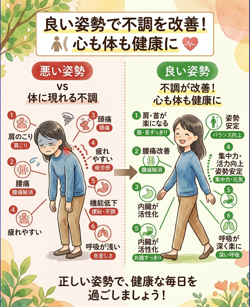 姿勢を整えることは、見た目が良くなるだけでなく、体の不調改善にも直結します。