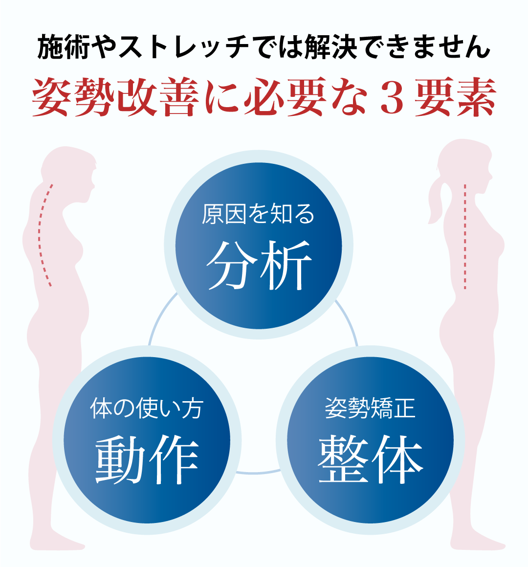 その場しのぎのもみほぐしは行っていません。原因を分析し、体の使い方を変えることで